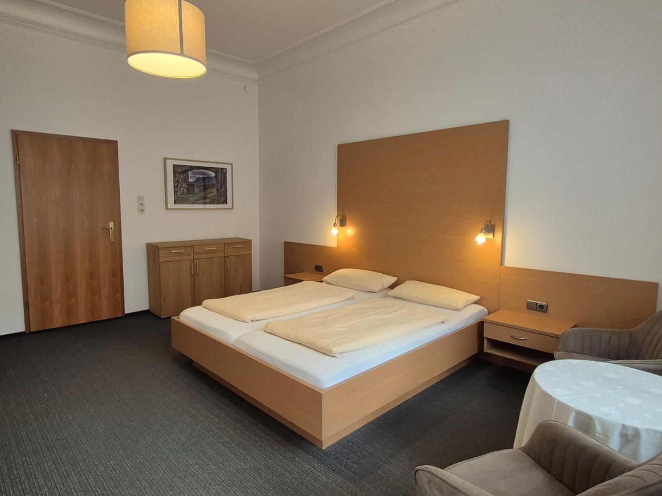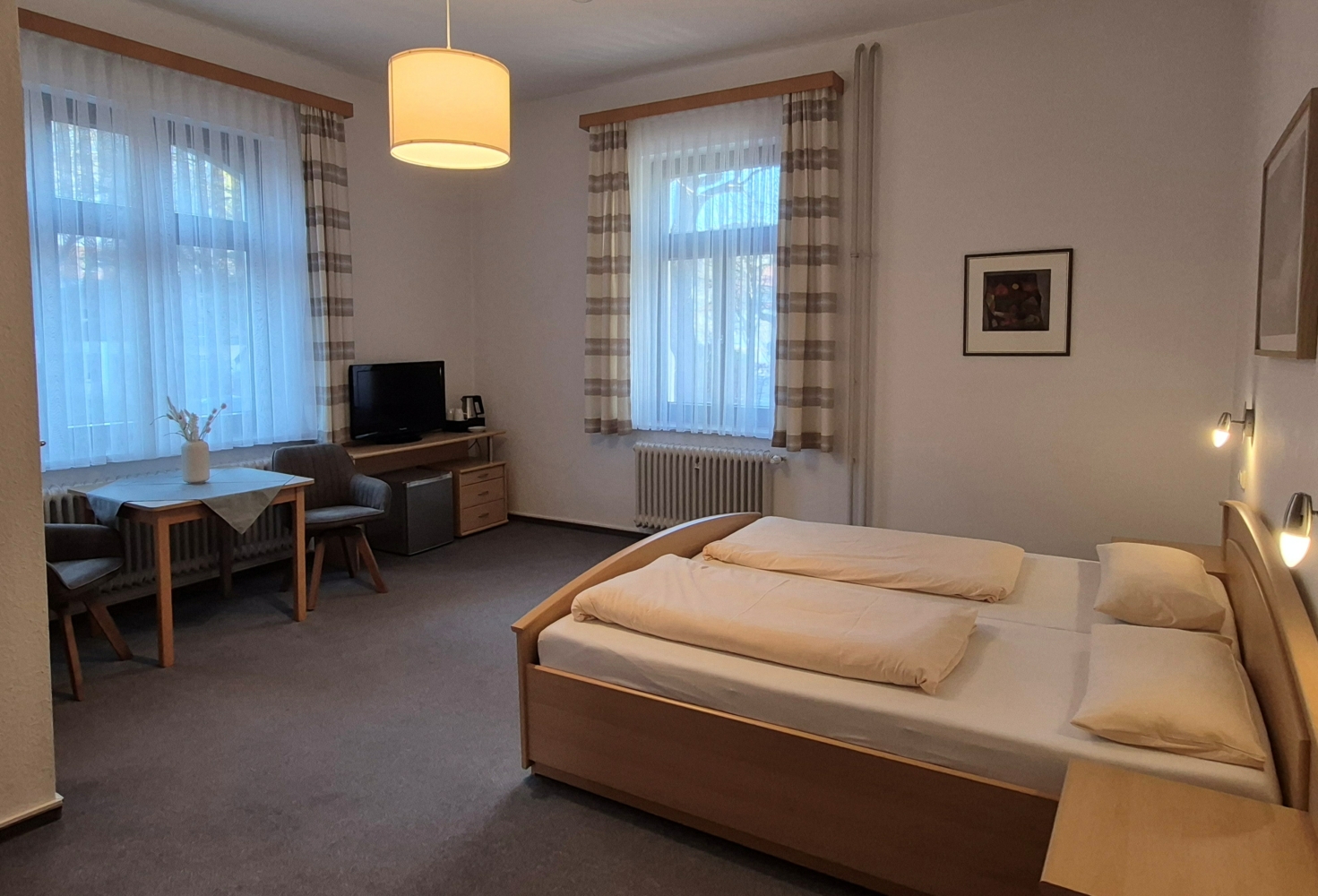 Unsere geräumigen Zimmer verfügen alle über Dusche/WC, einen Kühlschrank, einen Wasserkocher mit Heißgetränken, einen Haartrockner, eine kleine Sitzecke, Kabel-TV und kostenloses WLAN.